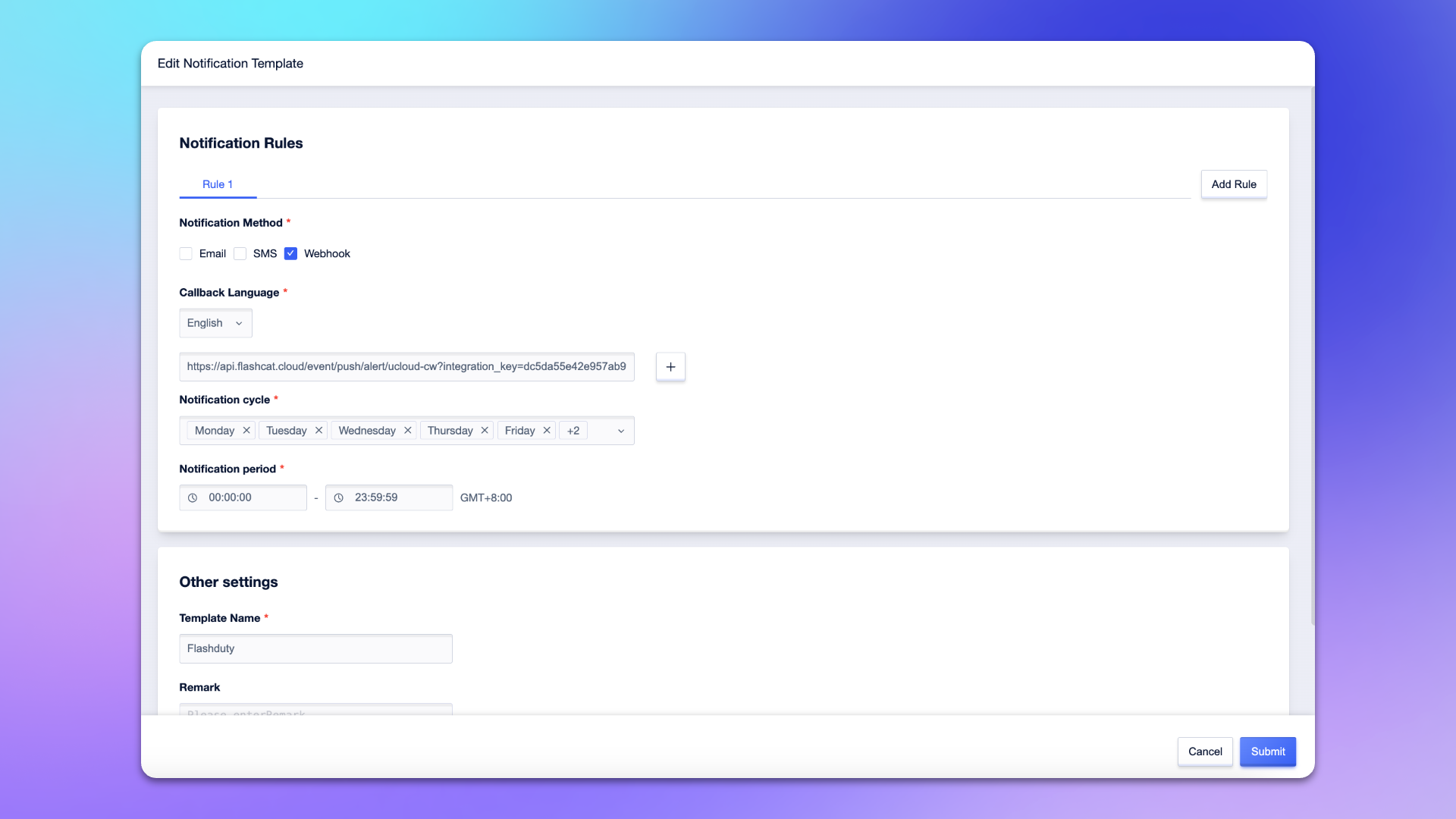 Flashdutyor another name for the template name. - Configure other options as needed.