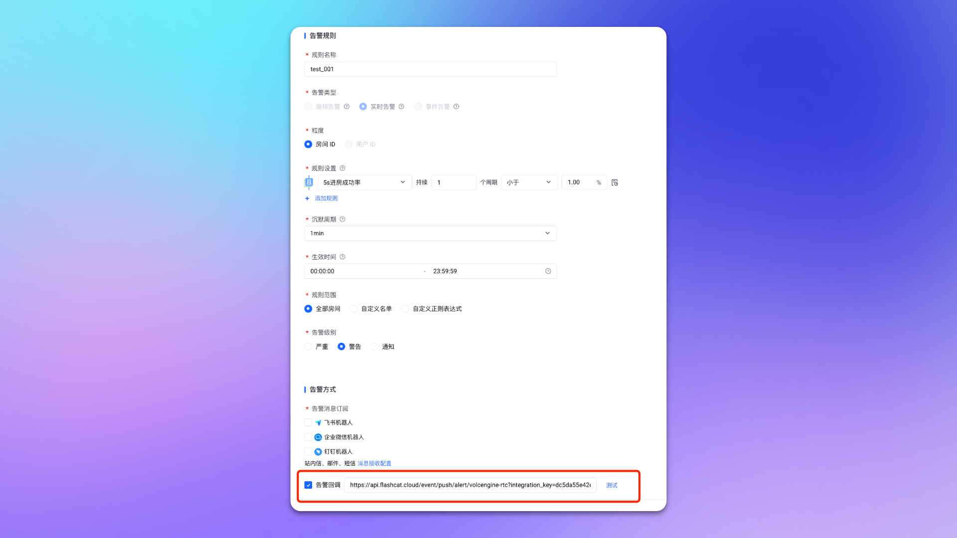 告警回调并输入告警集成的推送地址。 - 其他选项按需配置。